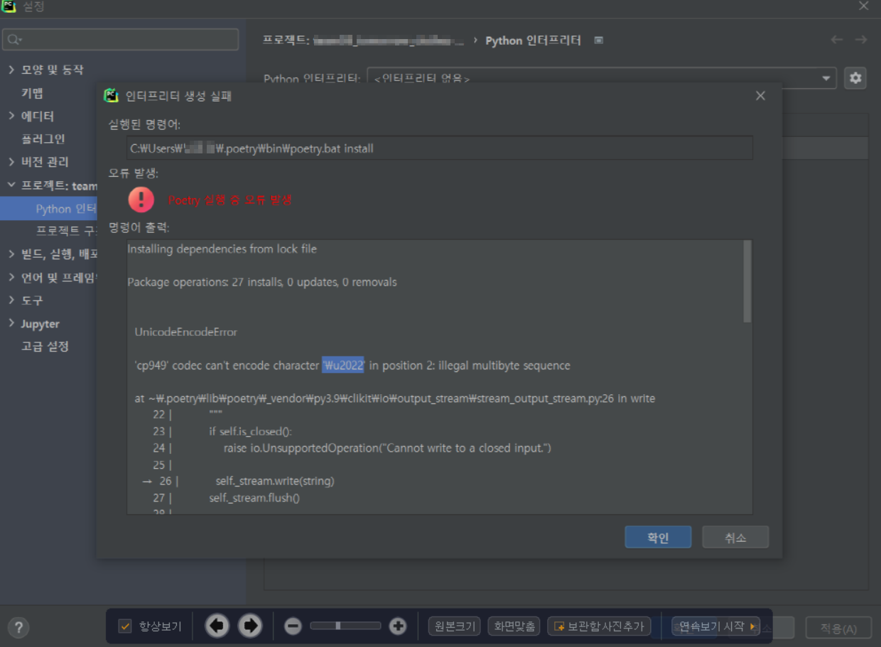 [에러] 파이참 poetry 설치 시 인코딩 에러 본문