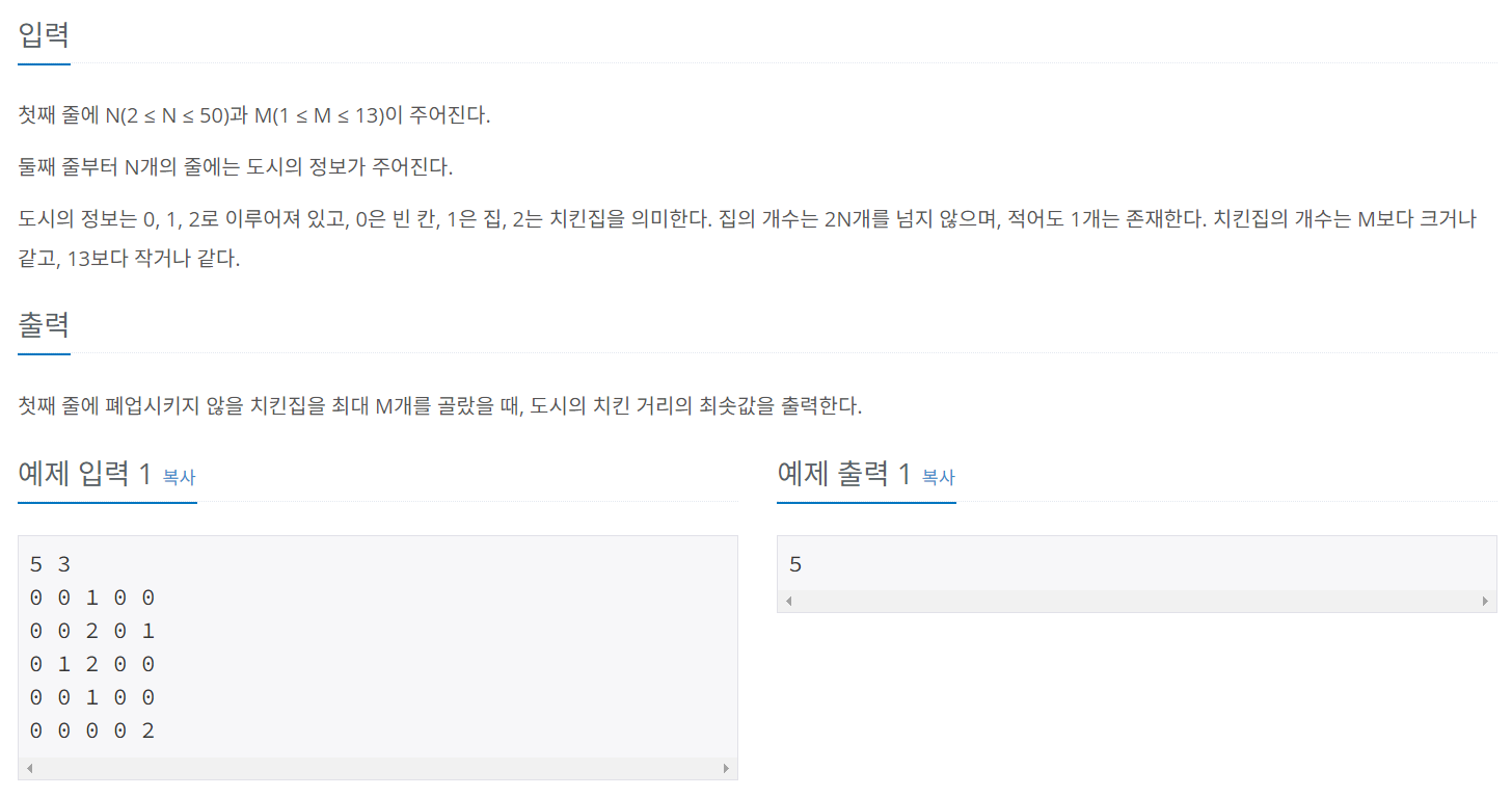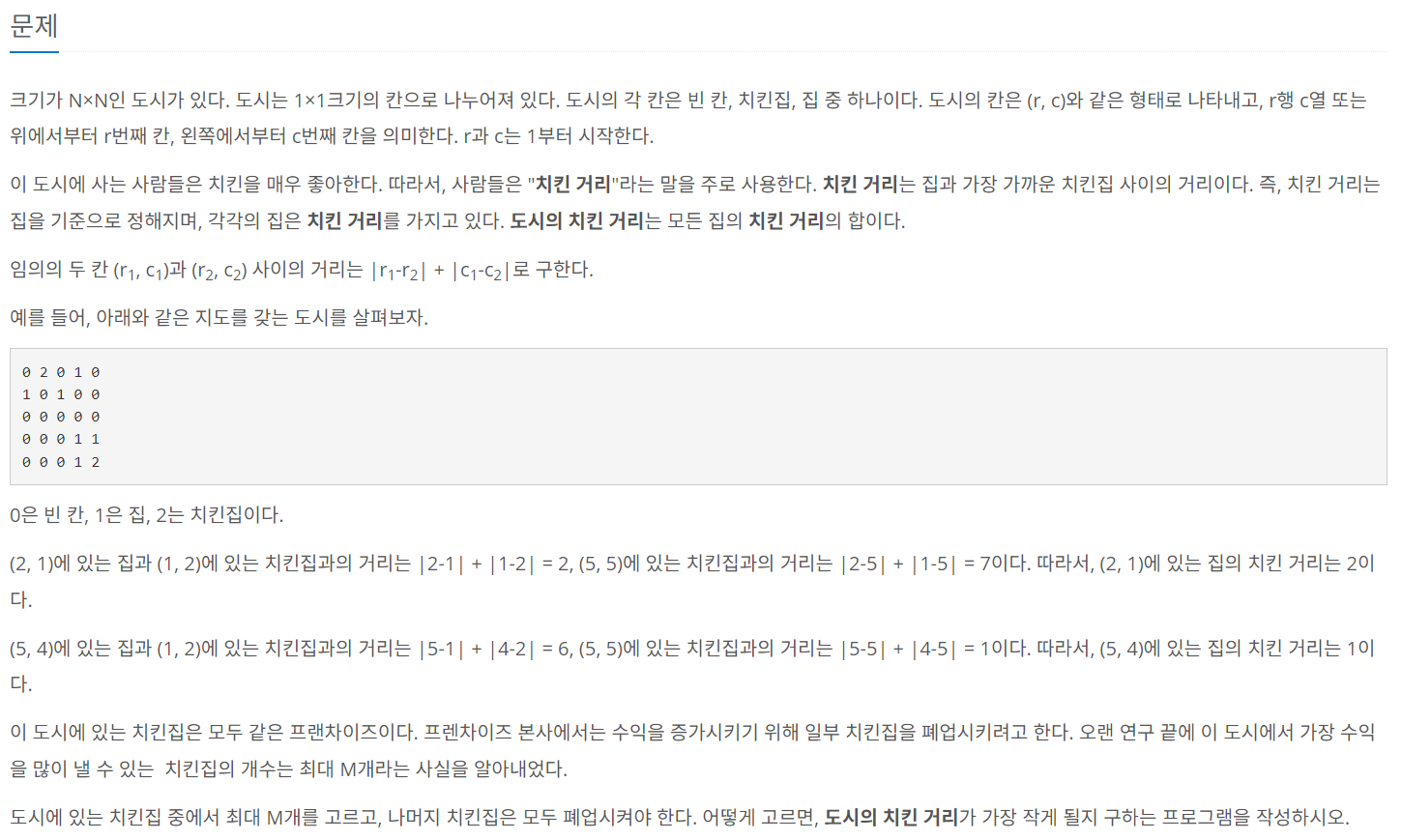 문제 문제 링크 : https://www.acmicpc.net/problem/15686 15686번: 치킨 배달 크기가 N×N인 도시가 있다. 도시는 1×1크기의 칸으로 나누어져 있다. 도시의 각 칸은 빈 칸, 치킨집, 집 중 하나이다. 도시의 칸은