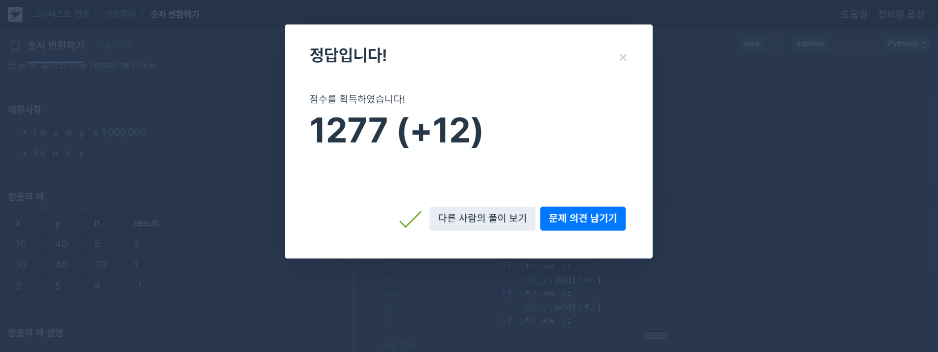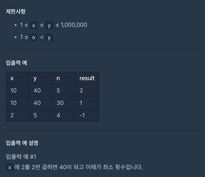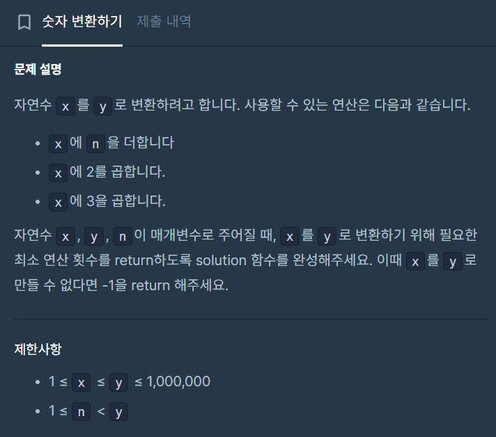 문제 설명 자연수 x를 y로 변환하려고 합니다. 사용할 수 있는 연산은 다음과 같습니다. x에 n을 더합니다 x에 2를 곱합니다. x에 3을 곱합니다. 자연수 x, y, n이 매개변수로 주어질 때, x를 y로
