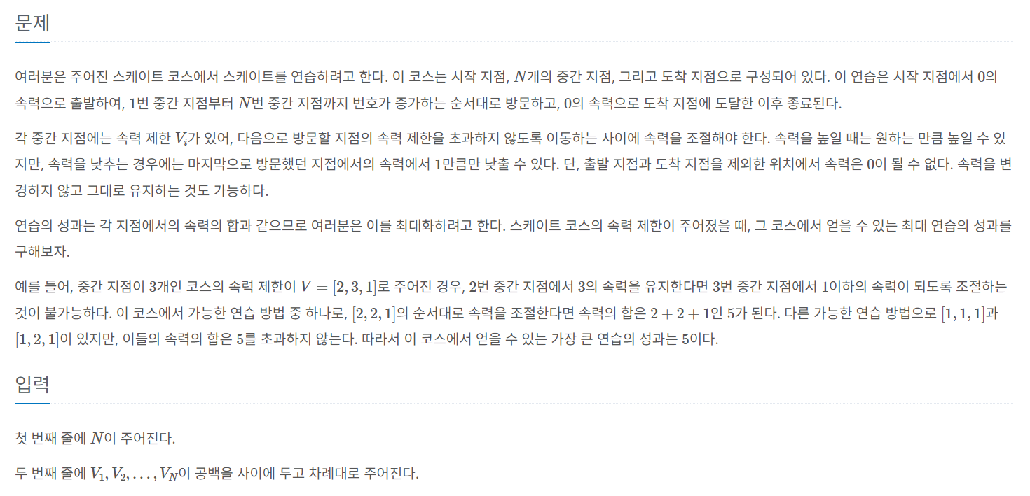 링크텍스트마지막 중간 노드의 속도는 무조건 1그 직전 i-1 번째 중간 노드는 주어진 제한 속도 내에서 최대로는, i 번째 중간 노드 보다 1 더 클 수 있다.