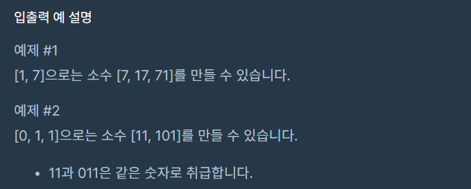 소수 자체를 판별하는 방법은 예전에 풀어봐서 알고 있었는데 가능한 조합을 찾는 방법이 바로 떠오르지 않았다. permutations 사용은 감이 왔는데 매번 달라지는 가짓수를 어떻게 선택하나 싶었다가 다른 분의 블로그에서 힌트를 얻을 수 있었다. 그냥 for문 돌리면서 가짓수를 변경한 조합을 리스트에 저장하고 나중에 join으로 합쳐준 뒤 int로 변경하면 되는 방식이었다.