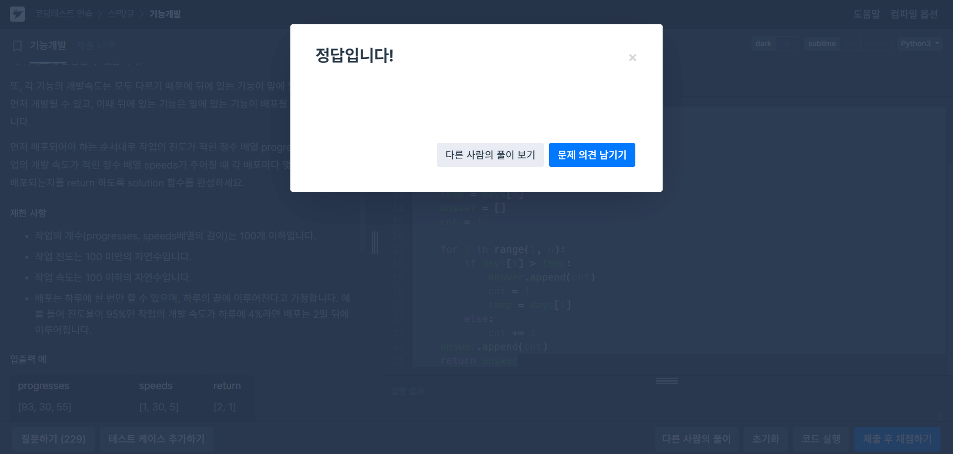 그 후 temp라는 변수에 days[0] 값을 초기값으로 두고 days 리스트를 1번째 인덱스부터 끝까지 돌면서 temp와 days[i]를 비교한다. 만약 temp가 days[i] 보다 크다면 days[i]는 temp가 끝날 때까지 대기해야 하므로 cnt에 +1을 해준다. 그 반대의 경우라면 그대로 answer 리스트에 cnt 값을 넣어준다. 모든 for문을 돌고 나면 최종 cnt가 answer 리스트에 추가되지 않은 채로 끝나므로 마지막 줄에 answer.append(cnt)를 추가해줘야 한다. 그리고 answer 리스트 리턴하면 끝!