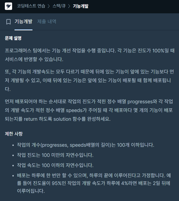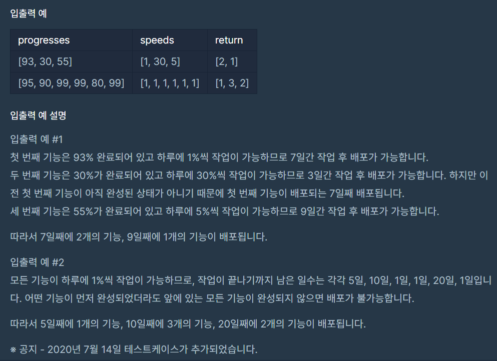 먼저 days라는 리스트를 두고 작업이 완료되는 날들을 append 해야 한다. 다만 하루의 끝에서 배포가 이루어지므로 만약 progresses가 speeds로 나누어 떨어지지 않으면 +1을 해줘야 한다.