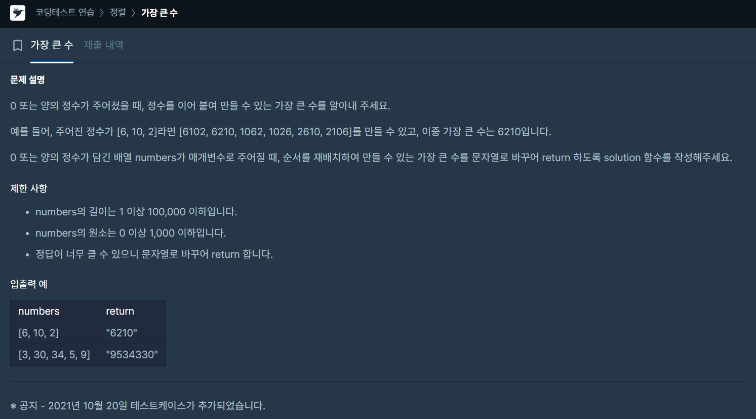 https://programmers.co.kr/learn/courses/30/lessons/42746 코딩테스트 연습 - 가장 큰 수 0 또는 양의 정수가 주어졌을 때, 정수를 이어 붙여 만들 수 있는 가장 큰 수를 알아내 주세요. 예를 들어, 주어진 정수가