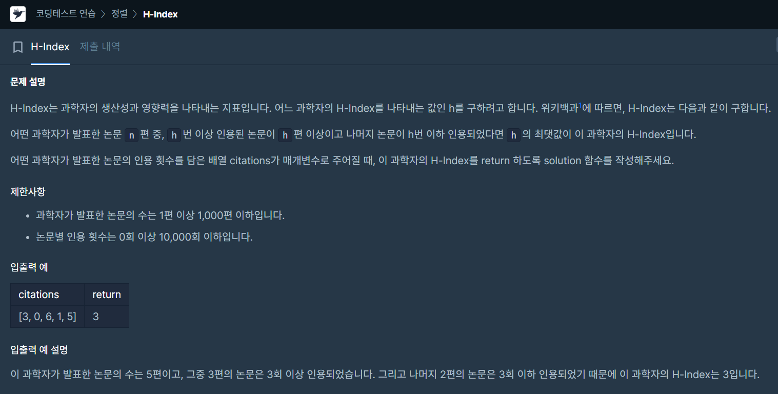 [스파르타] 99클럽 2기 코테스터디 8일차 TIL / H-Index 본문