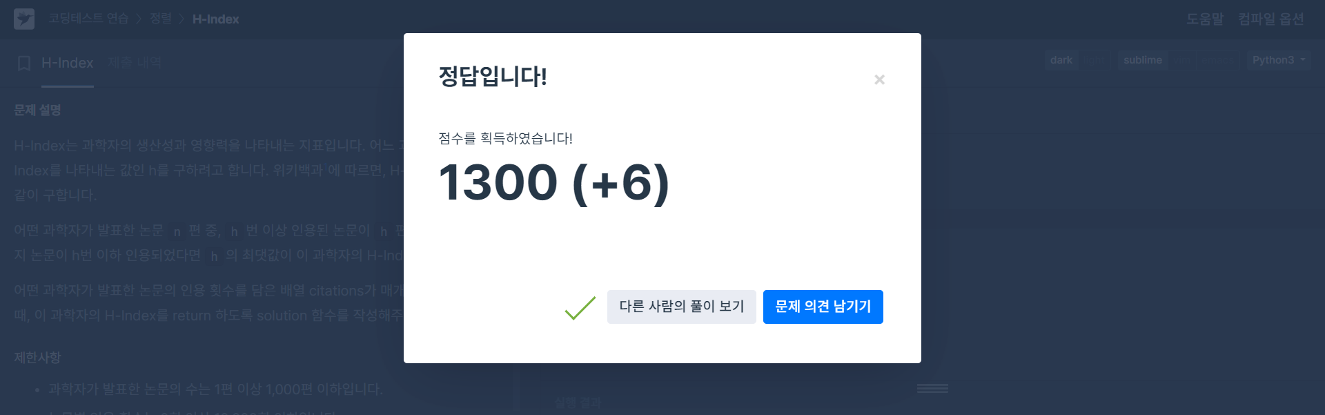 주어진 citations을 내림차순으로 정렬한 다음, 0부터 len(citations)을 반복문으로 돌려서 각각의 원소와 h 사이의 크기를 비교해주면 된다. (내림차순으로 정렬하는 이유는 h-index의 최댓값을 구해야 하기 때문) 예를 들어 [3, 0, 6, 1, 5]는 [6, 5, 3, 1, 0]으로 정렬시키고 for문을 돌려서 0번째 인덱스부터 문제의 조건대로 h보다 작은지 확인을 해준다. h보다 작은 경우에는 이미 h개의 요소가 있기 때문에 바로 h를 리턴해주면 된다.