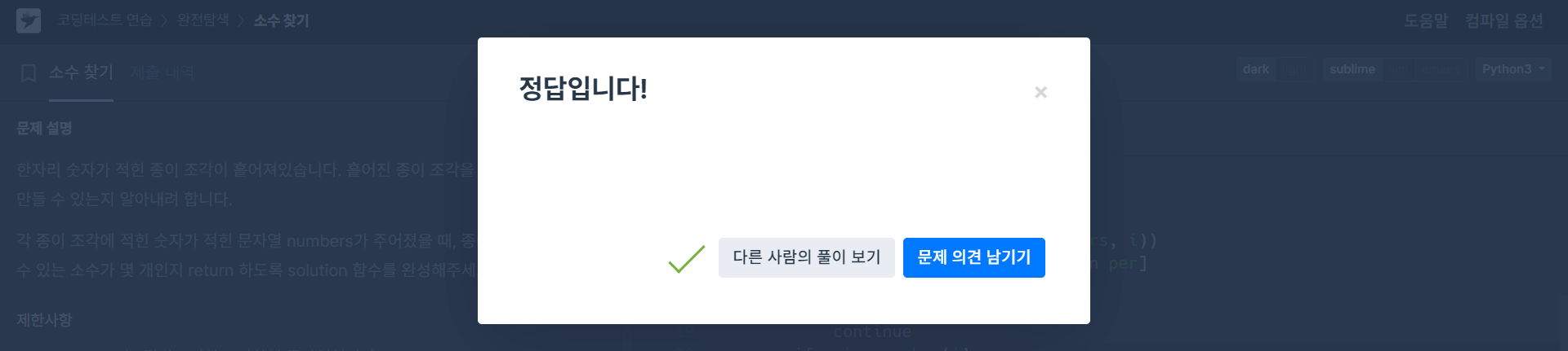 얼마 전 99클럽 1기에서 풀었던 문제라 이번에는 다른 분들의 풀이를 참고해서 다시 풀어봤다. 풀이 (1)는 set을 미리 정의해 두고 permutations으로 모든 조합을 넣은 후 다시 소수 판별을 하는 방식이었다. 풀이 (2)는 코드가 엄청 깔끔해 보여서 가져왔는데 makeCombinations 함수에서 재귀로 모든 경우의 수를 돌리는 게 신기했다. 만약 numbers에 '123'이 들어오게 되면 makeCombinations의 str1, str2에는 각각 ('', 123), (1, 23), (123, '') -> (13, 2), (132, '') -> (12, 3), (123, '') 이런 식으로 가능한 모든 조합이 생성된다. 이런 방법은 생각 못했는데 잘 기억해 뒀다가 나중에 써봐야겠다.