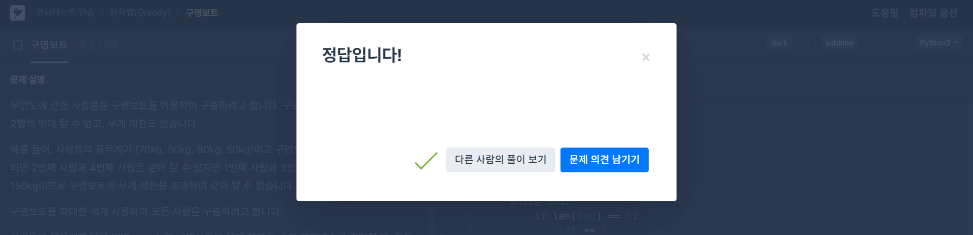 우선 people 리스트를 오름차순으로 정렬해야 한다. 그리고 while문을 돌면서 deq의 0번째 인덱스와 마지막 인덱스의 요소를 더했을 때 limit보다 작은지 확인한다. 여기에서 작다면 pop(), popleft()로 둘을 제거하고 cnt += 1을 해준다. limit을 초과했을 경우는 제일 큰 수인 마지막 인덱스 요소만 pop()으로 제거해 준다. 모든 사람들의 각 몸무게는 보트의 한계를 넘지 않으므로 따로 if문 조건을 거치지 않고 pop()만 해주면 된다. 다만 여기 if문에서 0번째 인덱스와 마지막 인덱스 요소를 비교하기 때문에 deq에 1개의 요소만 남았을 때도 생각해 주면 된다.