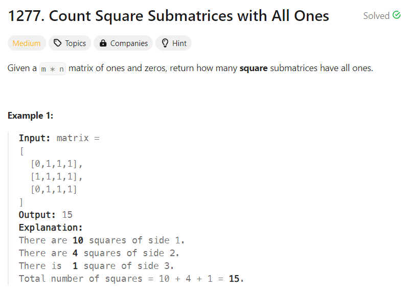 Leetcode: 1277. Count Square Submatrices with All Ones (링크)