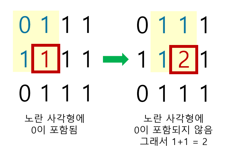 0번째 행과 열은 해당 위치에서 길이가 1인 사각형만 구할 수 있다. 그러므로 시작하는 위치는 1행, 1열의 요소에서부터다. 위의 이미지에서 빨간색 사각형으로 표시한 부분이 for문의 현재 위치다. 노란색 사각형으로 표시한 부분이 빨간색 사각형의 숫자를 갱신할지 말지 정하는 요소들이다. 만약 노란색 사각형 안에 0이 포함되어 있다면 길이가 2인 사각형은 만들 수 없다. 그러므로 그 다음 요소로 빨간색 사각형이 이동한다. 노란색 사각형 안에 0보다 큰 수만 있다면 그 중 최솟값을 빨간색 사각형 숫자에 더해서 갱신해준다.