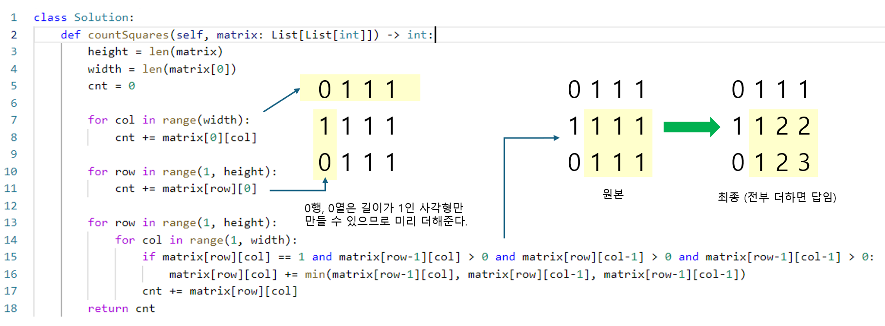 입력값으로 0, 1로 구성된 행렬이 주어지고 여기에서 모든 하위 사각형의 개수를 구하는 문제이다. 모든 행렬 요소를 for문으로 돌면서 처음에는 길이가 1인 사각형만 찾고 루프가 종료되면 다음에는 길이가 2인 사각형, 다음은 길이가 3인 사각형, ... 이런 식으로 루프를 더 이상 해당 길이의 사각형을 구하지 못할 때까지 계속 돌면 구할 수 있다. 그러나 시간이 오래 걸리고 비효율적인 방법이다. 따라서 기존 행렬을 for문으로 한 번만 돌면서 해당 위치에서 가능한 사각형 길이 개수를 갱신하는 방법으로 진행한다.