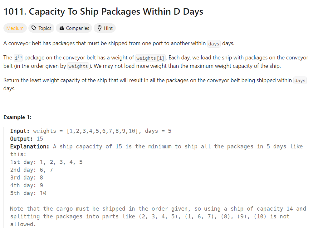 LeetCode: 1011. Capacity To Ship Packages Within D Days (링크)