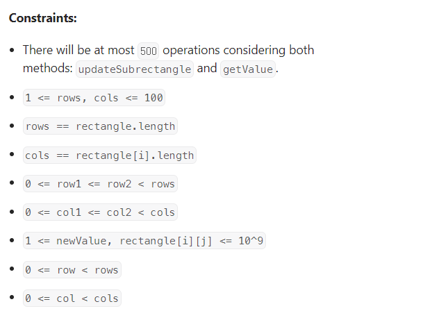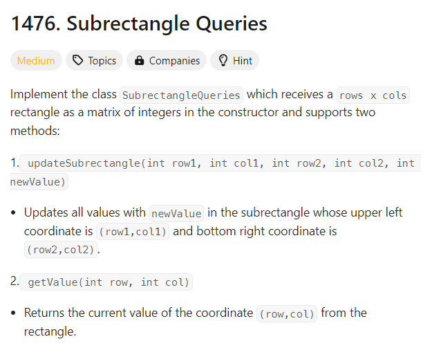 https://leetcode.com/problems/subrectangle-queries/ Subrectangle Queries - LeetCode Level up your coding skills and quickly land a job. This is the best place to expand your knowledge and get prepared for your next interview. leetcode.com SubrectangleQueri