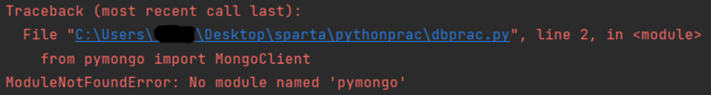 mongoDB를 전후로, 이틀에 걸쳐서 전부 수강했다. 총 수강시간은 6시간 정도 걸린 듯하다. 일단 아침 9시부터 상쾌하게 DB에 대한 설명을 듣고 강의 순서대로 mongoDB를 Pycharm에서 연결하려고 하는데, 갑자기 아래와 같은 에러 메시지가 나왔다. 강의 속에서는 엄청 스무스하게 넘어갔기 때문에 별 문제가 아닌가 보다 하고 구글링을 시작했는데, 그 후로 3시간 동안 해결하지 못했다. 그래서 팀원들한테 물어봤더니 dnspython이나 네트워크 문제 같다고 해서 그렇구나 하고, 패키지들을 삭제 후 재설치를 했다. 그러나 혹시 몰라서 pip, wheel 등의 패키지 버전을 다 업그레이드했는데도 되지 않았다. 내가 뭔가 잘못 건드렸나 싶어서 아예 파이썬을 싹 다 지우고 재설치를 했다. 그래서는 안됐는데... (Stay...)