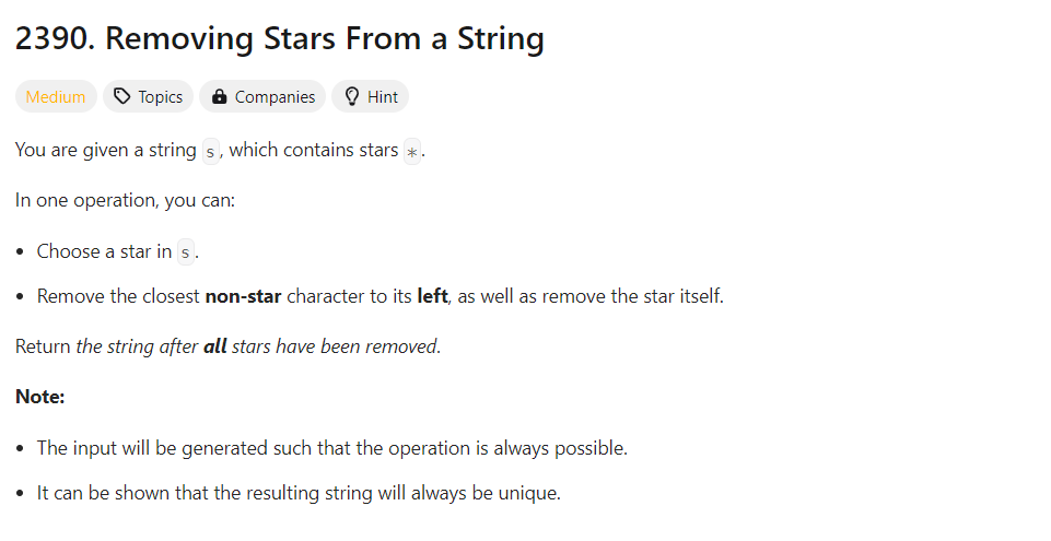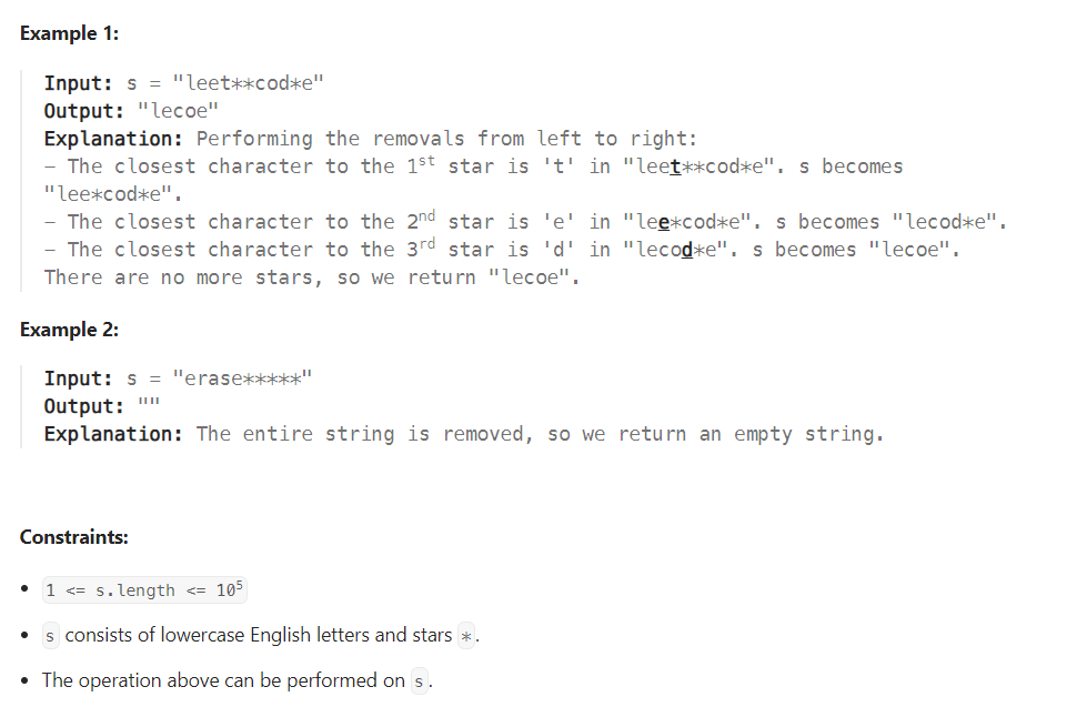 예1) 입력값: s = "leet**cod*e" / 출력값: "lecoe" (et, d 삭제됨)