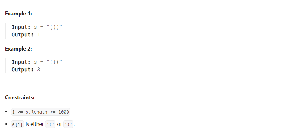 예1) 입력값: s = "())" / 출력값: (()) 여는 괄호 1개가 더 필요하므로 1 출력