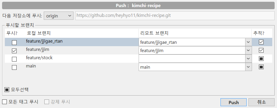 - 로컬 repo에 김치찜 요리법 생성하는 새로운 branch 생성하여 커밋 후, 원격 repo 브랜치 지정해 push 하기.
