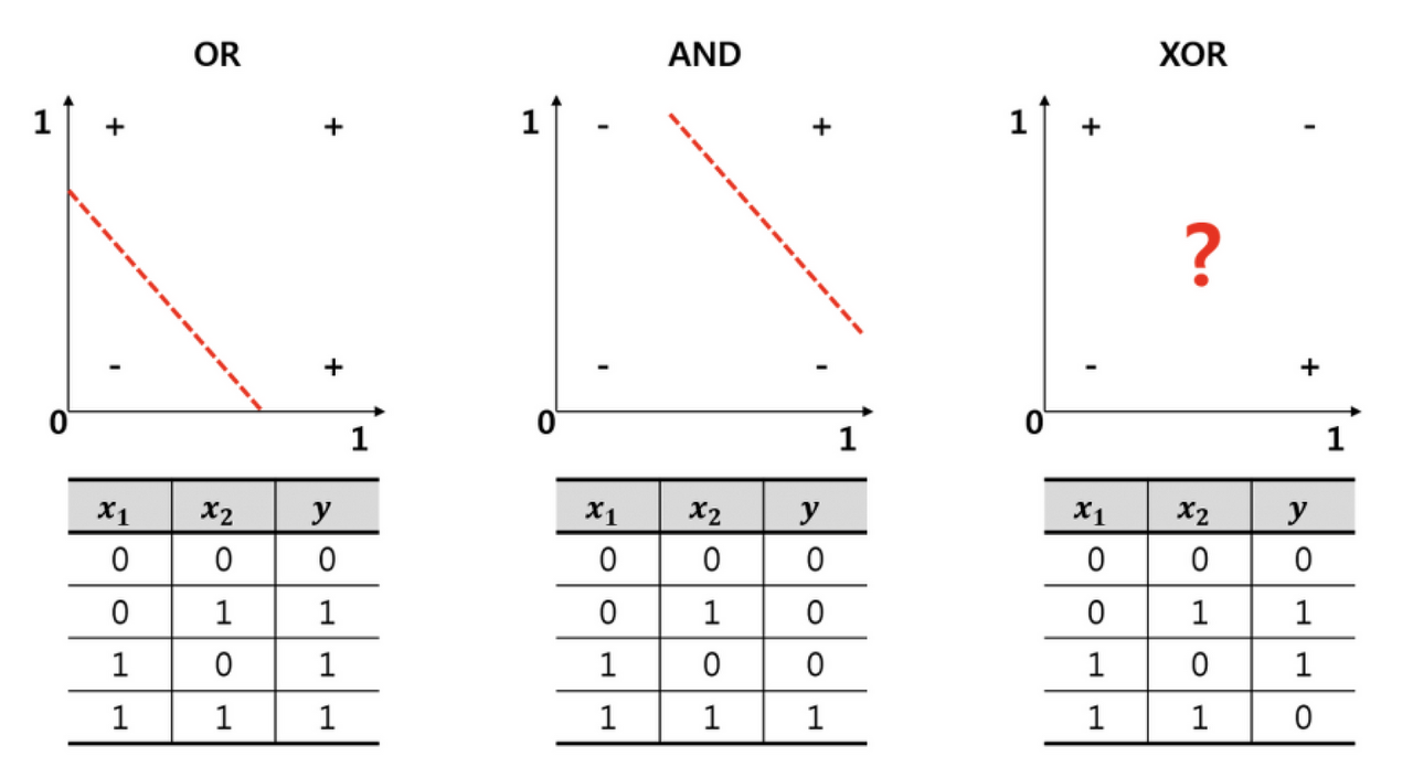 OR, AND, XOR (XOR는 선형으로 나눌 수 없다)