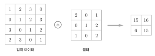 - 합성곱(Convolution): 입력데이터와 필터의 각각 요소를 서로 곱한 후 더하면 출력값이 됨.
